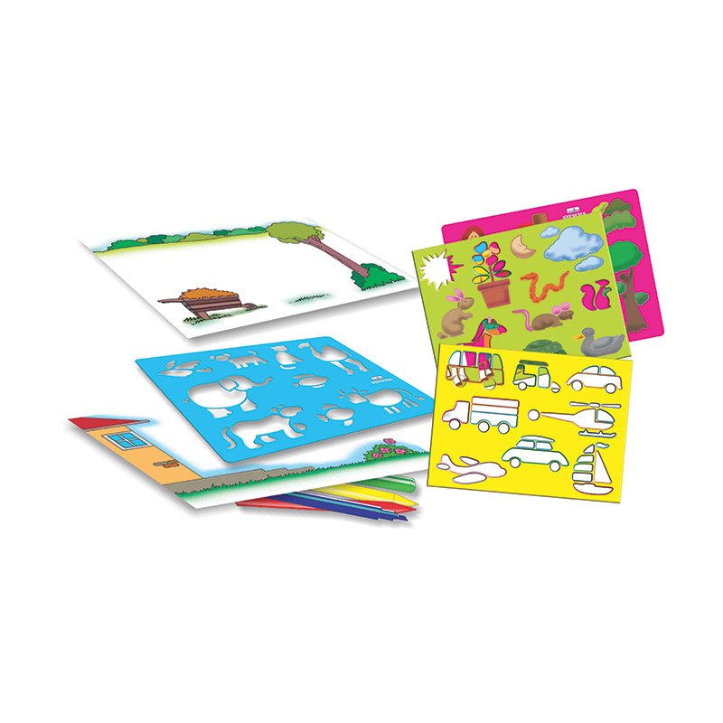 ‘Creative Stencil Art-2’ Drawing is an important skill for the children to learn at an early age. It provides the basics for developing their creative skills along with way of expression what they are feeling and thinking. In stage 1, The child will select anyone of the Picture- Practice Card, select stencils which are appropriate for the card, draw pictures with stencils, add details and colour the Practice Card beautifully using his imagination and creativity. In stage 2, The child will draw outlines of the animals, things, objects etc. with the help of appropriate stencils, add details and colour them in their natural colours. The pack includes 38 tough Stencils of Animals, objects etc., 8 picture-practice cards, 20 blank papers, and a set of colours.