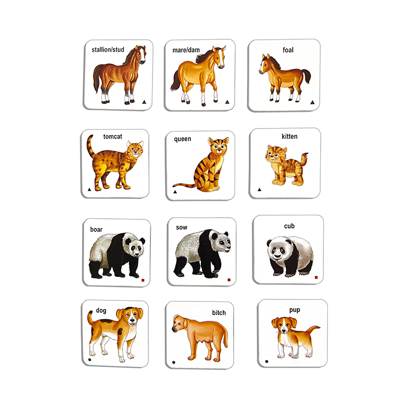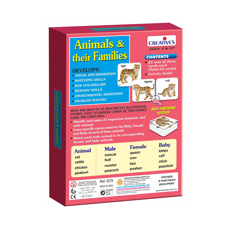 ‘Animal & their Families’ consists of 21 sets of self-correcting cards of important domestic and wild animals along with their families and an ‘Activity Guide’. In this game, children can identify and learn specific names of males, females and babies of these animals. The child is required to match male cards to their corresponding ‘Female & Baby cards’. They can also check their answers from the activity guide or with the help of the symbols given on the cards. The game is curriculum based and helps children in their academic learning while developing their visual discrimination and matching skills.
