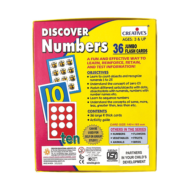 ‘Discover Numbers’ is an effective learning tool that introduces the young learners to numbers. By using these cards, the child will learn counting of numbers from 1 to 20 and will also be able to match the number of objects with the corresponding numerals. The game comprises 40 both side printed Jumbo cards to learn and reinforce counting and identifying numbers from 1 to 20 with the help of different activities and exercises. This way the child learns about numbers while developing their mathematical aptitude. The popular Creative’s Jumbo Flash Cards series currently offers 8 titles for ages 3 and above, each one focusing on an important learning topic.