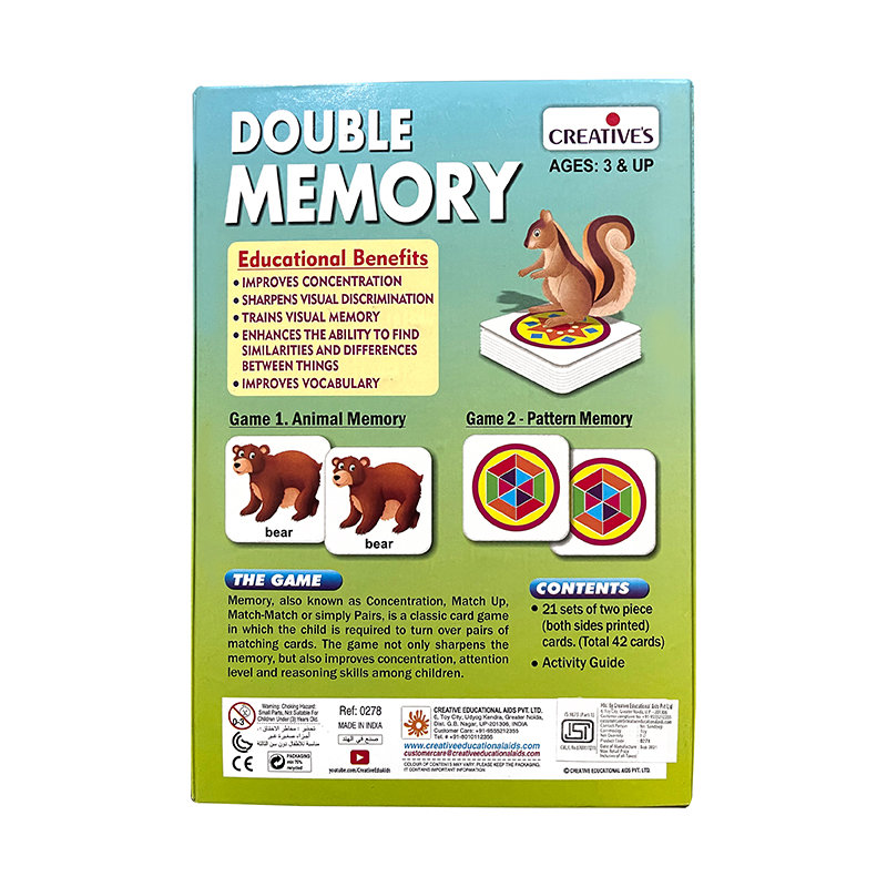 ‘Double Memory’ contains 21 sets of two side printed identical picture cards and an ‘Activity Guide’. In this game, children are required to look at different animals/patterns carefully, find and match two pictures of identical animals/patterns. It helps the child to improve concentration and retention as the child needs to remember the placement of already revealed cards. Thus this product by Creative’s is an excellent way to improve observation, memory and visual discrimination skills.