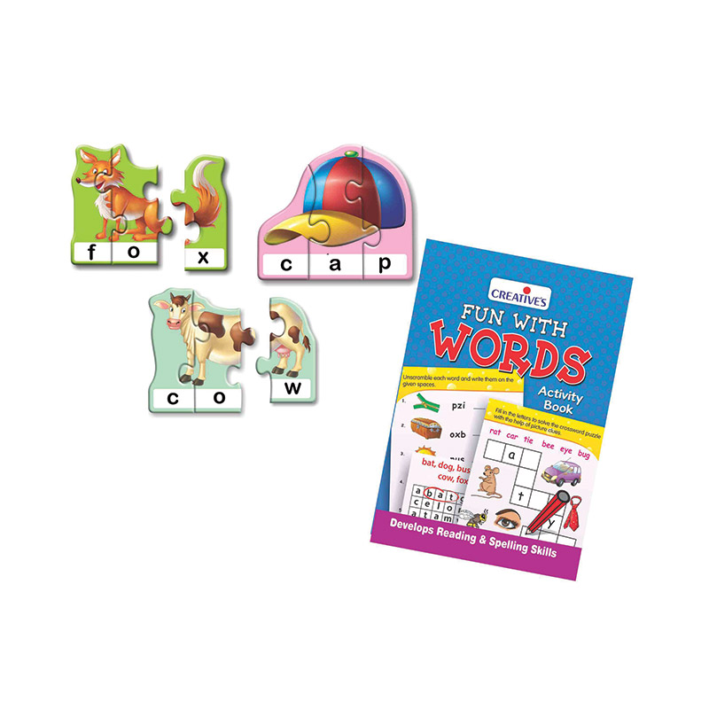 “Fun With Words” is a set of 30 self-correcting three piece word building puzzles, a 24 pages Activity Book and an Activity Guide. Children build 3-letter words by assembling beautifully illustrated pictures of objects relating to child’s immediate environment. As the child sort and join the correct pieces together to complete the pictures and spell the words he/she recognizes letters, learns spelling and build vocabulary. With the help of the Activity Book and suggestions given in the Activity Guide the child will be able to further practice many new words and strengthen spelling to improve concentration, observation and visual discrimination skills.