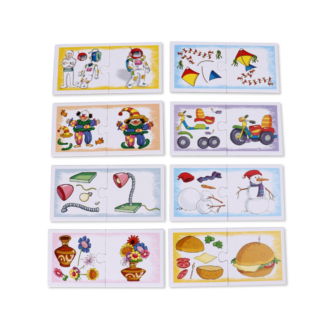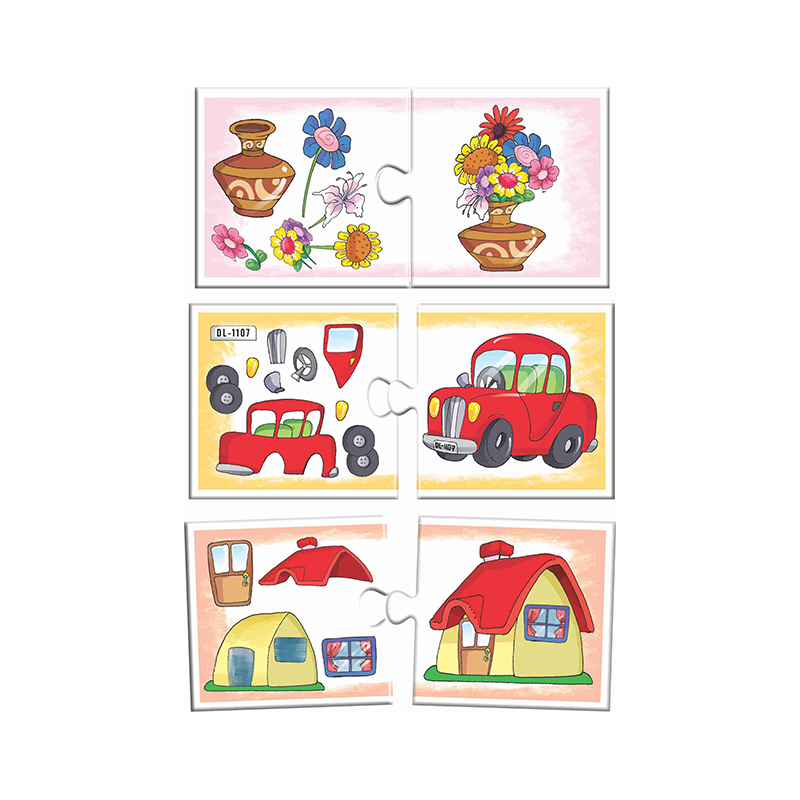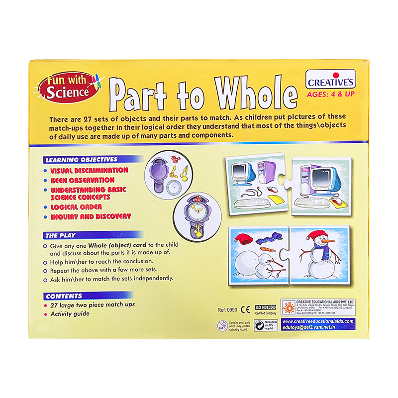 ‘Part to Whole’ game has been designed considering the inquisitive nature of children to find out about what things are made from. There are 27 sets of two piece match-ups depicting different objects on one card and its parts on another card. The child is required to carefully observe the whole (object) cards one-by-one and then look for the cards with the picture of parts it is made up of and then match them both. This way the child enhances his/her matching skills while getting their curiosity addressed in a playful manner.