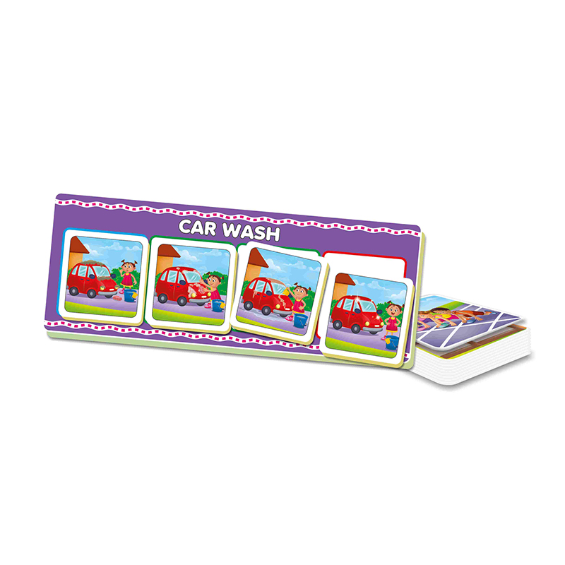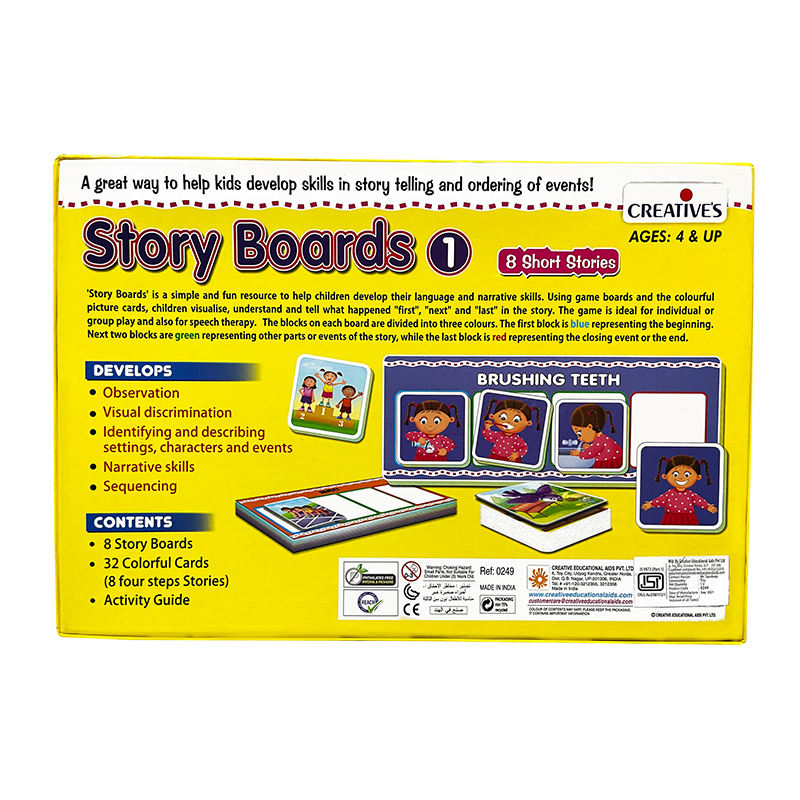 ‘Story Boards 1’ uses the beautiful illustrations to make children understand the key elements of a story; ‘What comes first’, ‘What comes in the middle’ and ‘What comes in the end’. The pack contains 8 story boards having four cards each. Each board has spaces having coloured borders with blue representing the beginning, green representing the middle and red representing the end of a story. Using the cards, children visualize and understand what comes first in the story and place the card on blue bordered space on the board. Similarly, he/she identifies what comes in the middle and place two cards in the middle. They will then finally identify what comes in the end and put it on the red bordered space. After identifying and placing the cards in correct order on the boards, children can now narrate the story in their own words developing their comprehension skills.