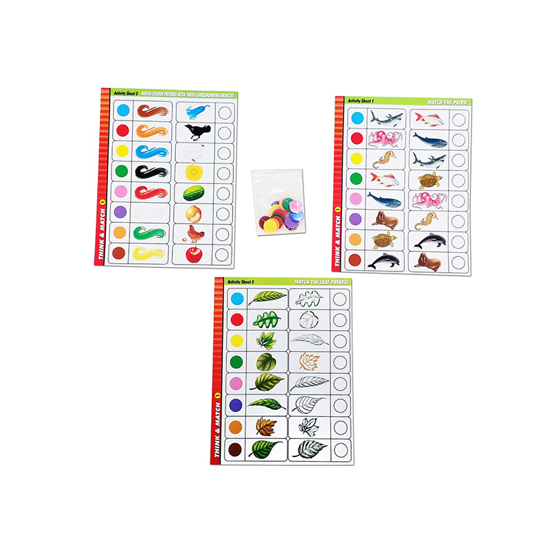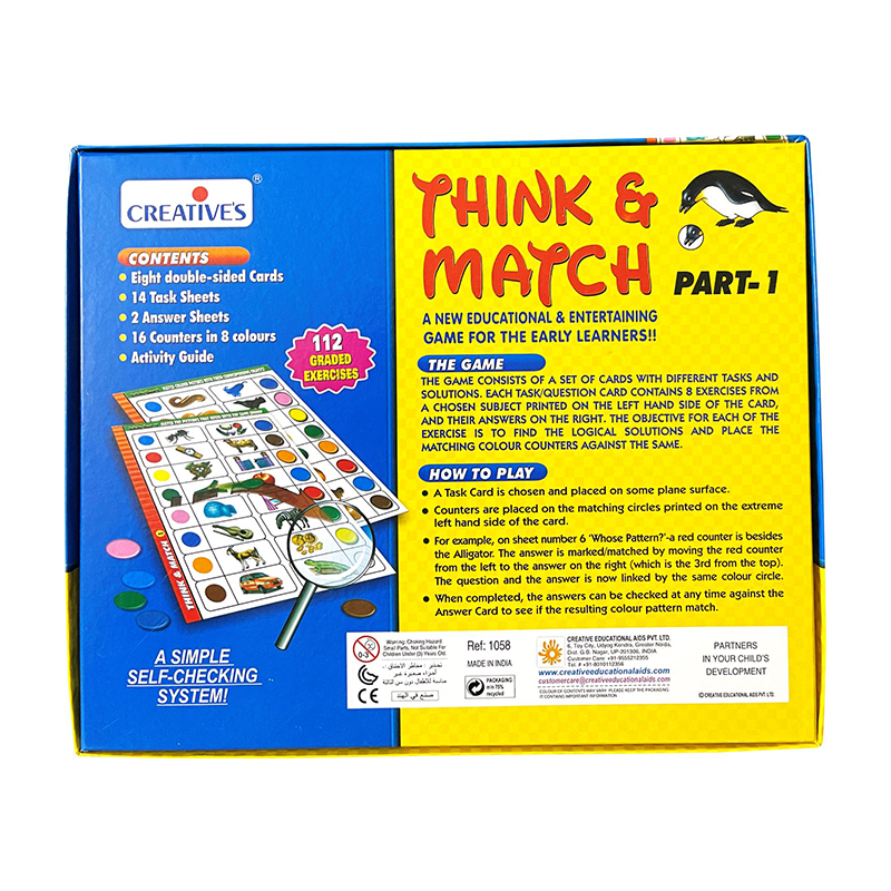 “Think & Match Part-1″ is an innovative game to encourage logic and reasoning skills in children. The game consists of 8 thick and laminated cards printed both sides, with 14 curriculum-based ‘Task Sheets’ and 2 ‘Answer Sheets’ and an ‘Activity Guide’. Each Task/Question Sheet contains 8 exercises from a chosen topic of a subject printed on the top of the sheet, and their answers on the right hand side in random order. The child is required to find the logical solution of each exercise/question and put matching colour counter against the same. When completed, the answers can be checked from the Answer Card to see if the resulting colour pattern matches. When all the Task Sheets have been completed successfully, the child would have covered and practiced 112 exercises on important curriculum topics and developing their abilities like good reasoning, logical thinking, and observation skills.