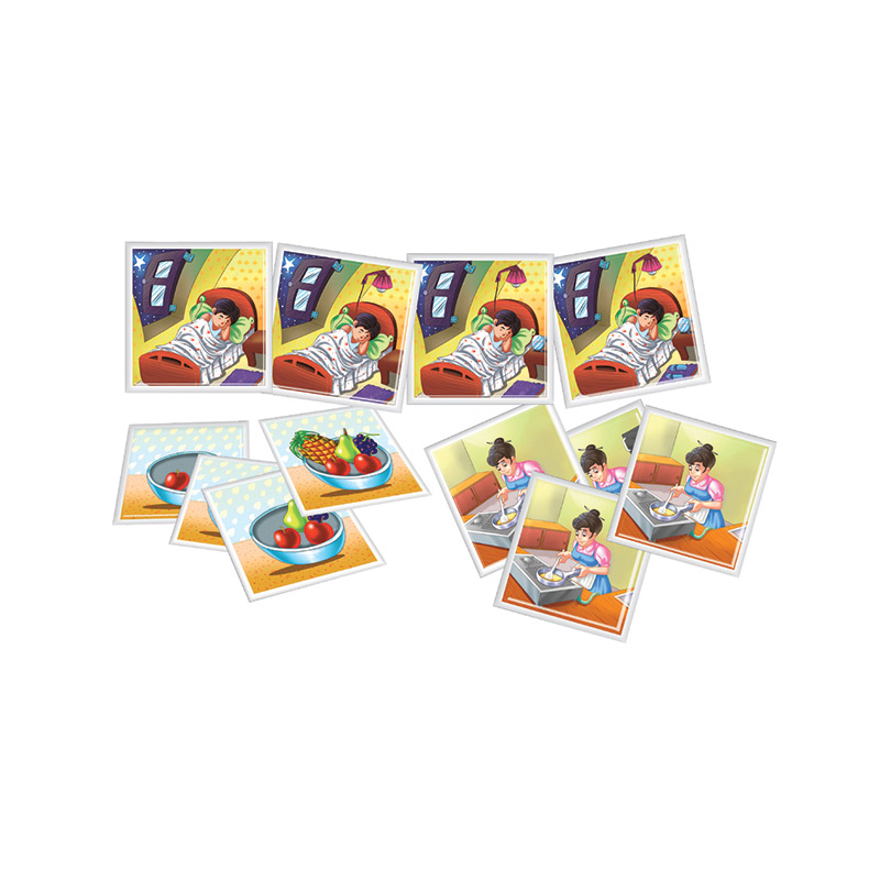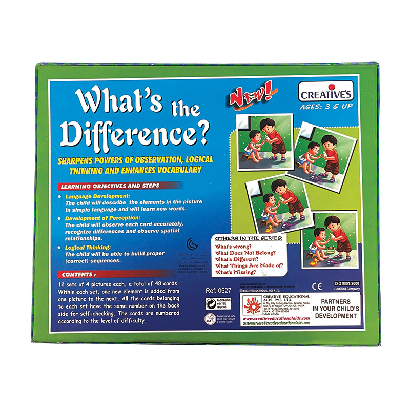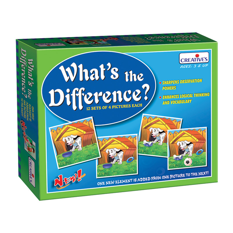 ‘What’s the Difference?’ is a visual based game to help children to develop their visual discrimination and problem solving skills. The game has 12 sets, each having 4 similar picture cards with an added element from one picture to next picture. The child is required to carefully observe all four cards of a set one-by-one and identify the added object with reference to the previous card. This way, children develop their observation and logical thinking skills while improving their concentration and visual discrimination skills.